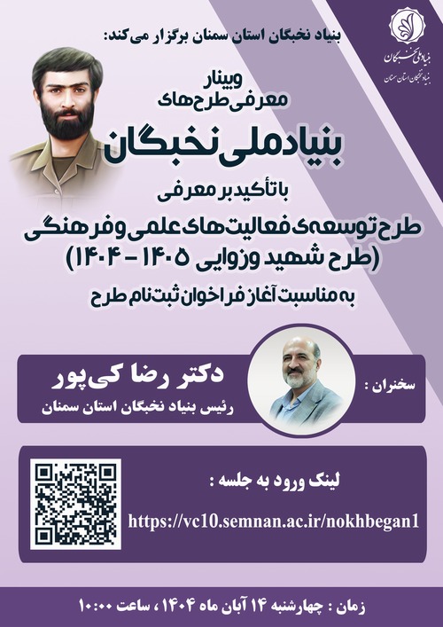 اطلاعیه آغاز فراخوان ثبت نام متقاضیان بهره مندی از تسهیلات دانشجویی بنیاد ملی نخبگان برگزاری کارگاه معرفی و تبیین طرح های بنیاد ملی نخبگان با تاکید بر طرح پشتیبانی از فعالیت های علمی و فرهنگی 1404/08/18 - 08:42 تعداد بازدید: 22 کلمات کلیدی بنیاد_نخبگان