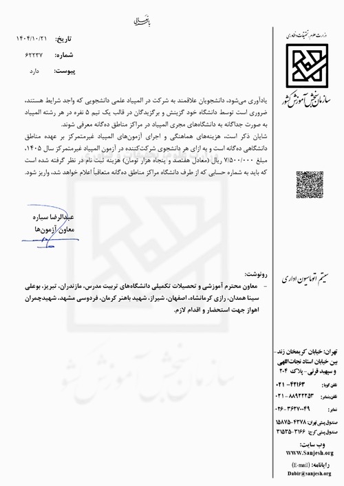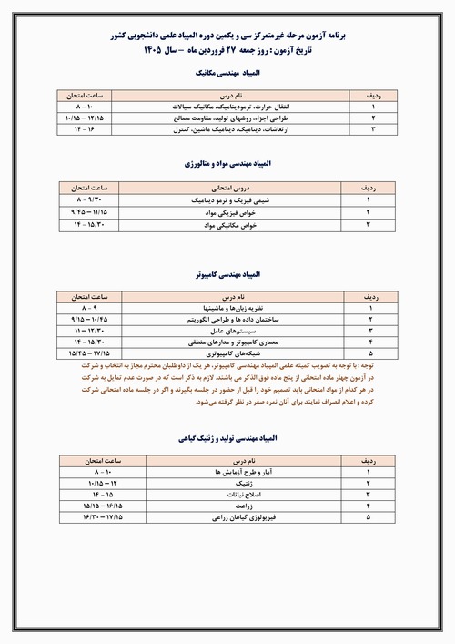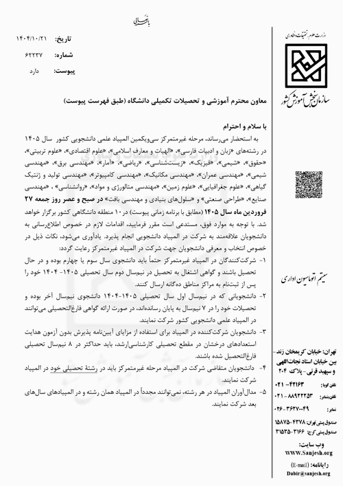 اطلاعیه اعلام تاریخ برگزاری المپیاد غیرمتمرکز سال 1405دانشگاه های کشور 1404/10/30 - 12:00 تعداد بازدید: 20 دانشجویان مهندسی مکانیک هر چه سریعتر در المپباد کشوری شرکت بفرمایید. کلمات کلیدی المپیاد_علمی