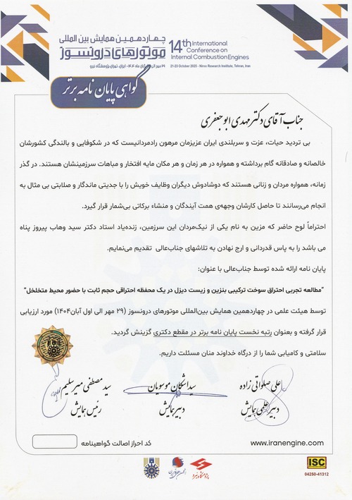 به گزارش روابط عمومی دانشکده مهندسی مکانیک؛ معاون آموزشی و تحصیلات تکمیلی دانشکده مهندسی مکانیک با اعلام این خبر گفت : در جریان برگزاری چهاردهمین همایش بین‌المللی موتورهای درونسوز که از تاریخ ۲۹ مهر تا ۱ آبان سال ۱۴۰۴ در تهران در پژوهشگاه نیرو  برگزار شد، رساله آقای دکتر مهدی ابوجعفری، فارغ‌التحصیل رشته مهندسی مکانیک دانشگاه سمنان، با موضوع «مطالعه تجربی احتراق سوخت ترکیبی بنزین و زیست دیزل در یک محفظه احتراقی حجم ثابت با حضور محیط متخلخل» به عنوان رساله برتر مقطع دکتری در جشنواره علمی- فنی این همایش انتخاب شد و لوح تقدیر مزین به نام زنده‌یاد استاد وهاب پیروزپناه، از اساتید علم موتورهای درونسوز به ایشان اهدا شد.