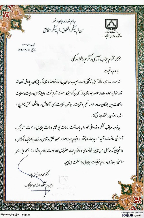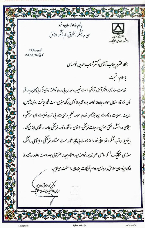 به گزارش روابط عمومی دانشکده مهندسی مکانیک در جلسه اخیر شورای دانشکده مهندسی مکانیک مورخه 1404/8/27 ، طی مراسمی رسمی از زحمات و تلاشهای بی وقفه جناب آقای عبدالواحد کمی، مدیر گروه آموزشی ساخت و تولید و جناب آقای شهاب الدین خوارزمی، مشاور فرهنگی دانشکده مکانیک با اهدای لوح تقدیر شد.