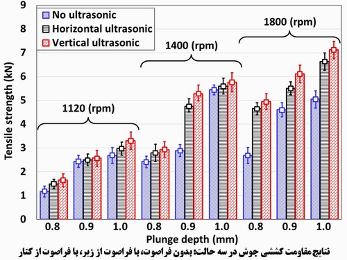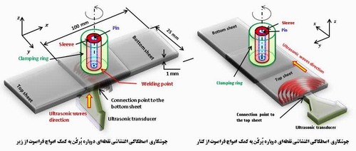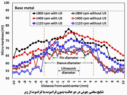این پژوهش به بررسی تأثیر امواج فراصوت بر فرآیند جوشکاری اصطکاکی اغتشاشی نقطه‏ای دوباره پُرکن (RFSSW) در اتصال ورق‏های آلیاژ آلومینیوم T6-6061 پرداخته است.RFSSW یک فرایند حالت جامد است که برای اتصال ورق‌های فلزی سبک مانند آلومینیوم بدون ذوب فلز پایه به‌کار می‌رود. در این روش، ابزار پس از نفوذ به قطعات، ماده نرم‌شده را دوباره به درون حفره بازمی‌گرداند و سطح را صاف و بدون حفره باقی می‌گذارد. هدف اصلی، بهبود استحکام مکانیکی و ریزساختار ناحیة جوش از طریق ترکیب روش RFSSW با امواج فراصوت در دو حالت عمودی و افقی بود. آزمایش‏ها تحت سه متغیر انجام شدند: سرعت دورانی ابزار 1200-1800 rpm، عمق نفوذ (8/0-1 میلیمتر)، و توان فراصوت (400-1000 وات). نتایج نشان داد که اعمال امواج فراصوت بویژه در حالت عمودی، استحکام کششی را تا 20% افزایش می‏دهد (از 7/3 به 2/5 کیلونیوتن) و ریزساختار ناحیة همزنی را بهبود می‏بخشد. تحلیل ریزساختاری با میکروسکوپ نوری و الکترونی روبشی تأیید کرد که امواج فراصوت موجب ریزدانه شدن و کاهش عیوبی مانند حفره‏ها می‏شوند. همچنین، سختی سنجی ویکرز بهبود 15-20% سختی در ناحیة جوش تحت تأثیر فراصوت را نشان داد. با استفاده از روش طراحی آزمایش‏ها، شرایط بهینه برای دستیابی به بالاترین استحکام، سرعت دورانی 1460 rpm، عمق نفوذ 9/0 میلی‏متر، و توان فراصوت 1000 وات تعیین شد. آزمون‏های کشش و ورکندگی تأثیر معنادار جهت امواج فراصوت را بر استحکام اتصال تأیید کردند. دلیل این امر نیز بیشتر دو علت بود: یکی نزدیک بودن نوک شیپورة فراصوت به محل اتصال و دیگری فشرده شدن محل اتصال در اثر امواج فراصوت در حالت عمودی نسبت به افقی