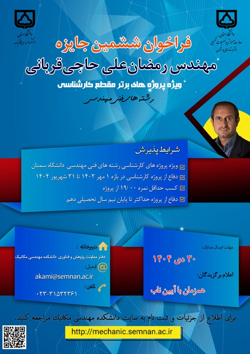 ششمین دوره جایزه شادروان مهندس رمضانعلی حاجیقربانی توسط دانشکده مهندسی مکانیک در حال برگزاری است.