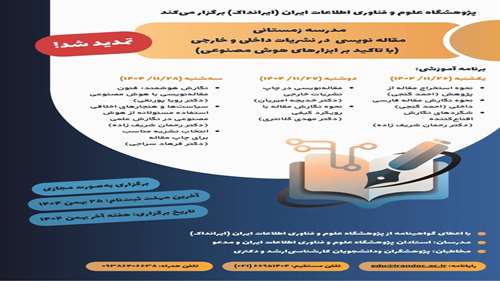 اطلاعیه مدرسه زمستانی مقاله نویسی در نشریات داخلی و خارجی (با تاکید بر ابزارهای هوش مصنوعی) 1404/10/30 - 11:45 تعداد بازدید: 29 کلمات کلیدی